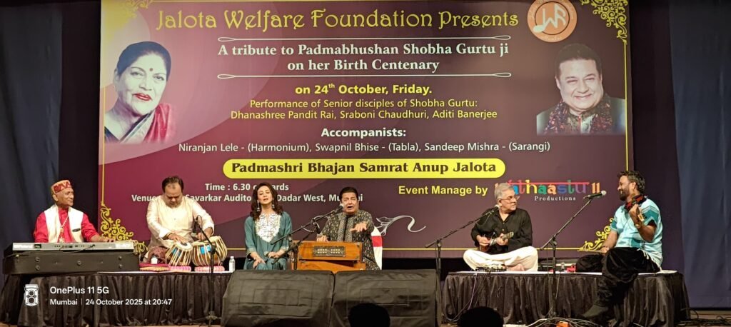 मुंबई: जलोटा वेलफेयर फाउंडेशन के तत्वावधान में पद्मभूषण शोभा गुर्टू जी की जन्म शताब्दी के उपलक्ष्य में एक विशेष संगीतमय श्रद्धांजलि समारोह का आयोजन किया गया। यह कार्यक्रम 24 अक्टूबर, शुक्रवार को वीर सावरकर ऑडिटोरियम, दादर पश्चिम, मुंबई में आयोजित किया गया। कार्यक्रम का शुभारंभ शाम 6:30 बजे से हुआ।