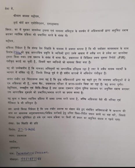 वहीं पत्र जारी करते हुए ये भी आरोप है आयंत गंभीर एवं चिंताजनक तथ्य यह है कि कुछ अधिवक्ताओं द्वारा यह कहते हुए कि नामजद अभियुक्तों में से एक अधिवक्ता भी है, माना कैंट, प्रयागराज परिसर में धरना-प्रदर्शन किया जा रहा है। यह धरना पूर्णतः बेबुनियाद, तथ्यहीन एवं विधि-विरुद्ध है तथा इसका एकमात्र उद्देश्य पुलिस प्रशासन पर अनुचित दबाव बनाकर उत अपराधिक मुकदमे को प्रभावित/समाप्त कराने का प्रयास करता है।